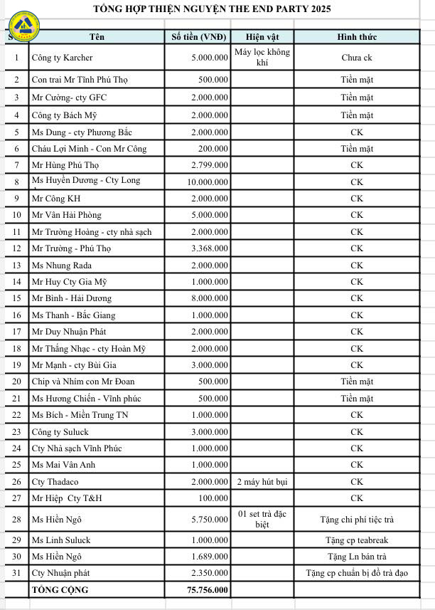 Thay mặt Ban Tổ chức YEP 2025 Miền Bắc, đại diện Chi hội gửi lời cảm ơn chân thành đến tất cả các mạnh thường quân, các thành viên đã nhiệt tình tham gia và đóng góp cho quỹ thiện nguyện.